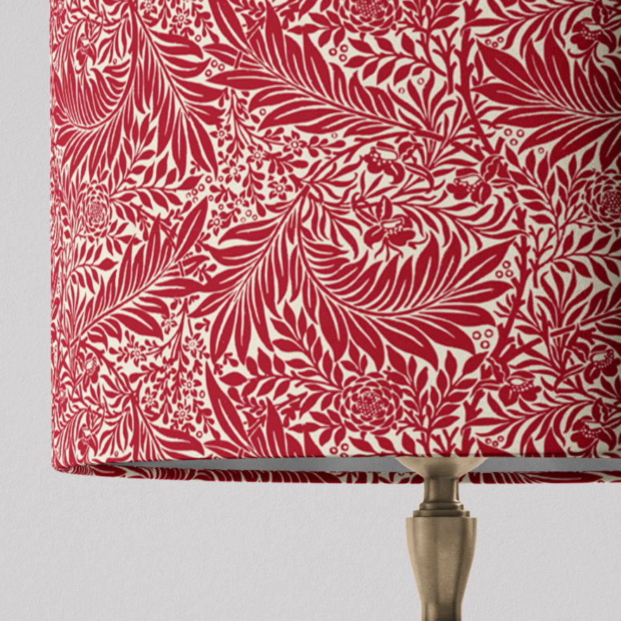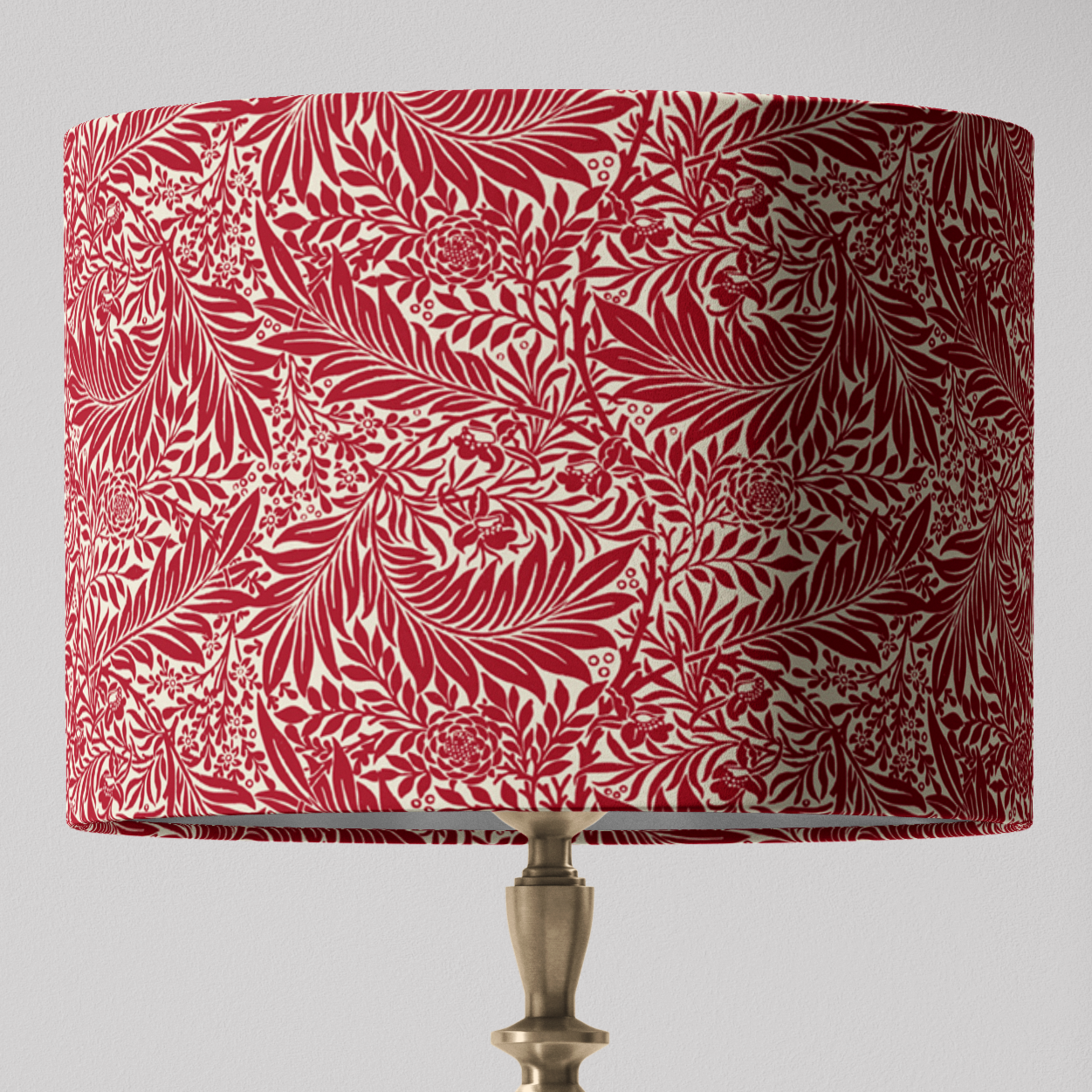 William Morris lampshade, handcrafted with the enduring Larkspur fabric in Red. This intricate pattern has remained a distinguished staple of home decor for over a century.